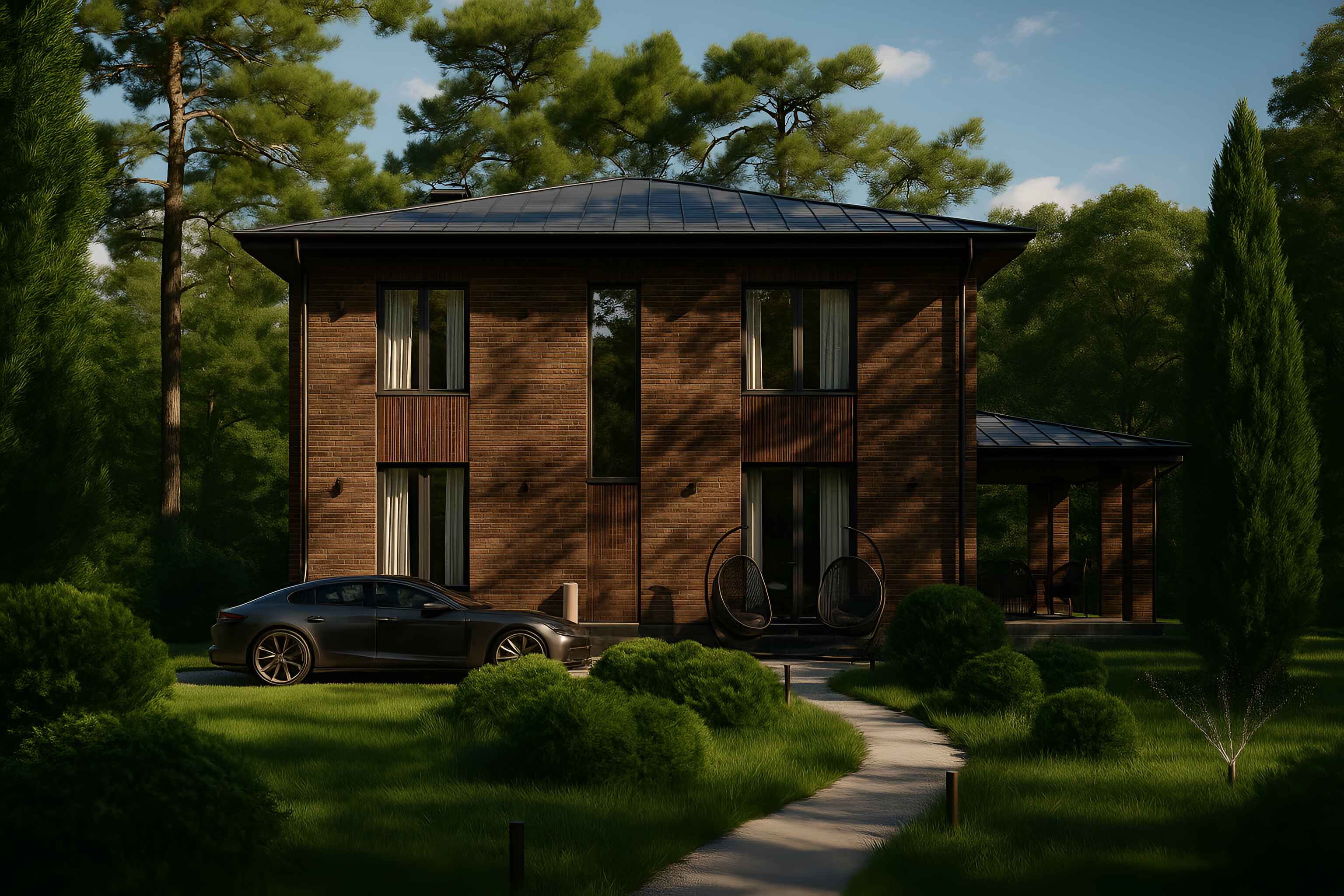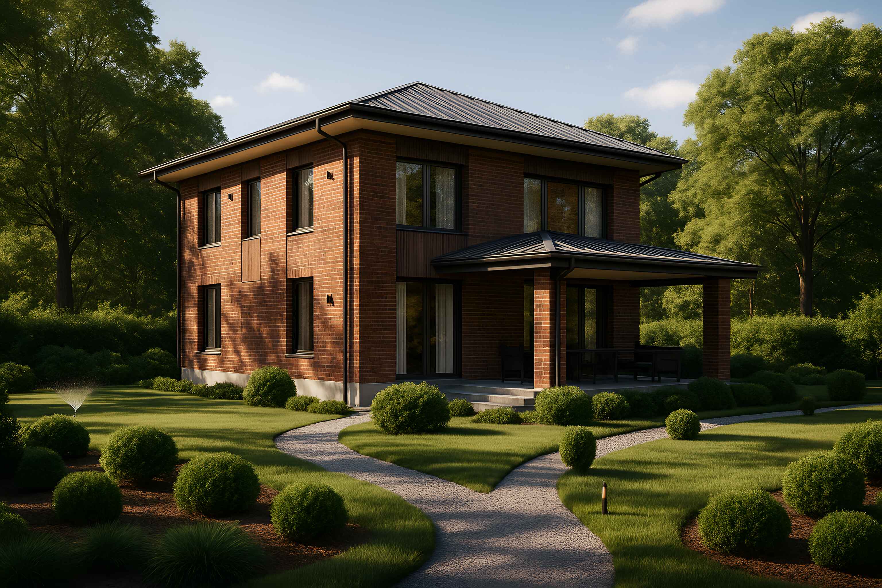 Штучная цементно-песчаная черепица BRAAS с необходимыми доборными элементами. Подкровельная мембрана «Ютайвек». Отделка карнизов и свесов кровли фиброцементной доской, либо софитами Docke.