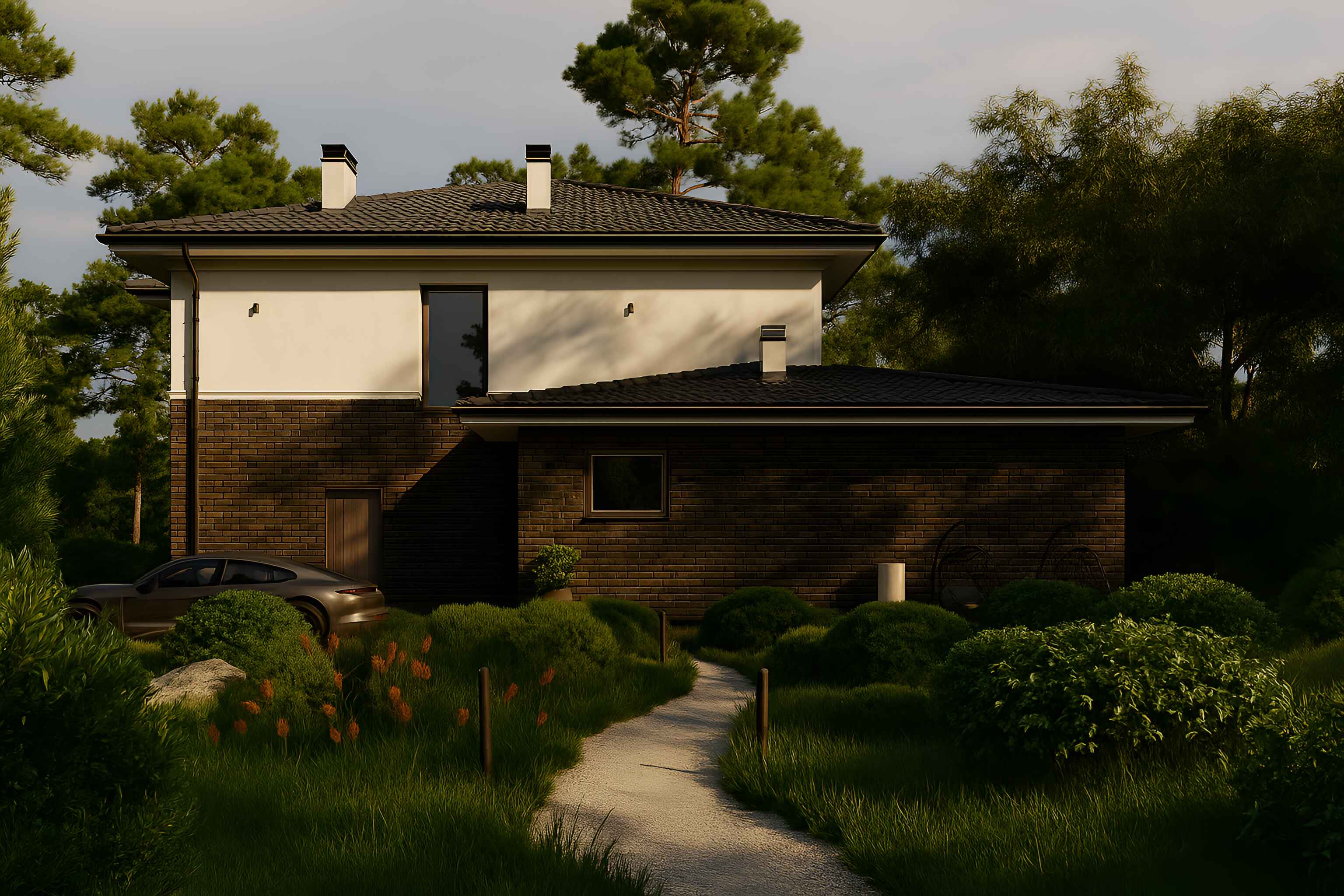 Штучная цементно-песчаная черепица BRAAS с необходимыми доборными элементами. Подкровельная мембрана «Ютайвек». Отделка карнизов и свесов кровли фиброцементной доской, либо софитами Docke.