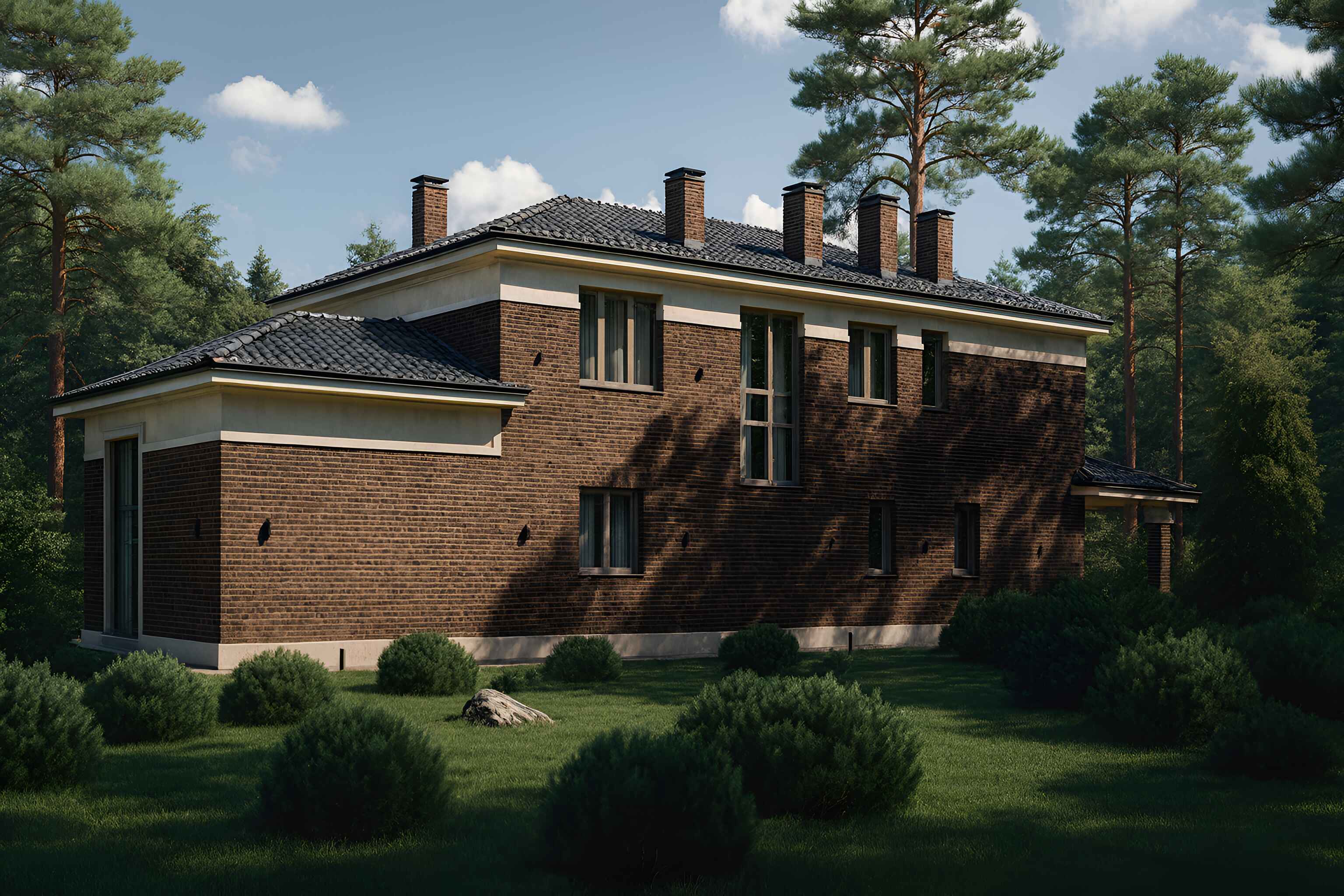 Штучная цементно-песчаная черепица BRAAS с необходимыми доборными элементами. Подкровельная мембрана «Ютайвек». Отделка карнизов и свесов кровли фиброцементной доской, либо софитами Docke.