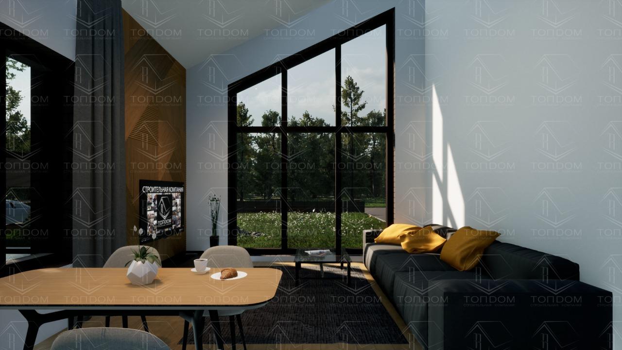 Пространство внутри дома организовано с учетом современных потребностей и функциональности. Просторная гостиная с высокими потолками является центром семейных встреч, а свет, проникающий через большие окна, наполняет пространство светом и теплом.