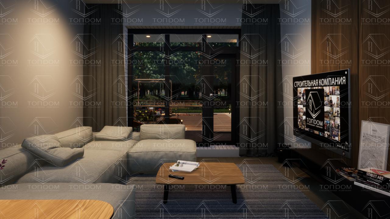 Интерьер подчеркивает простор и свободу форм. Открытая планировка создает единое пространство, в котором гармонично объединены гостиная, кухня и столовая. Большие панорамные окна обеспечивают максимум света, а отделка в натуральных цветах добавляет уюта и тепла.