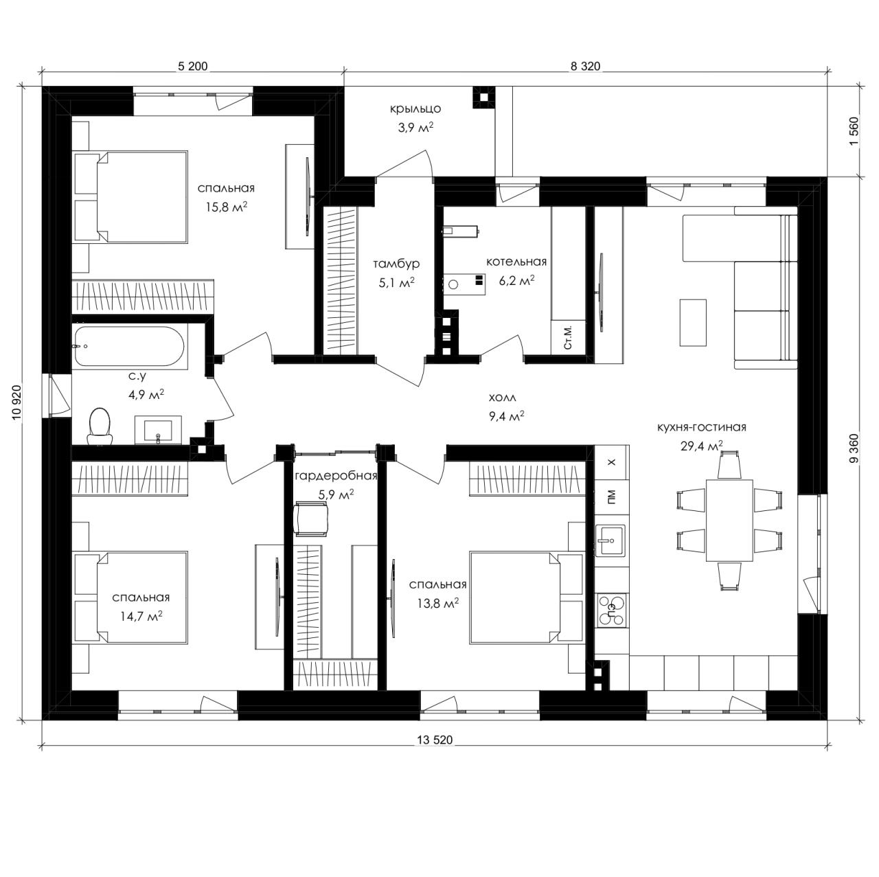 Главный принцип дизайна дома - максимальная функциональность при сохранении уюта и комфорта. Большие панорамные окна обеспечивают большое количество естественного света, делая дом светлым и просторным. Открытая планировка общих зон создает ощущение единства и гармонии внутри дома.