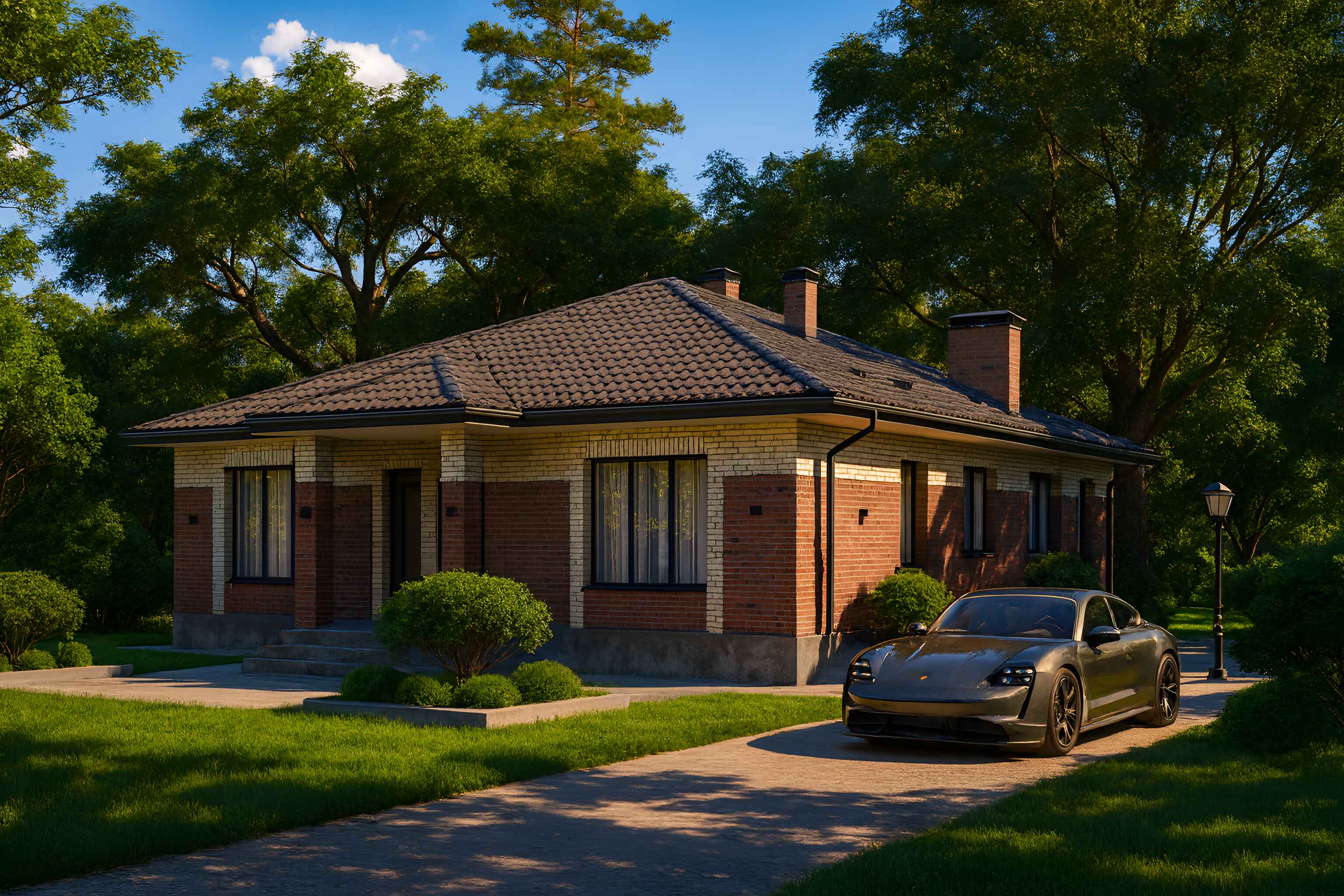 Штучная цементно-песчаная черепица BRAAS с необходимыми доборными элементами. Подкровельная мембрана «Ютайвек». Отделка карнизов и свесов кровли фиброцементной доской, либо софитами Docke.