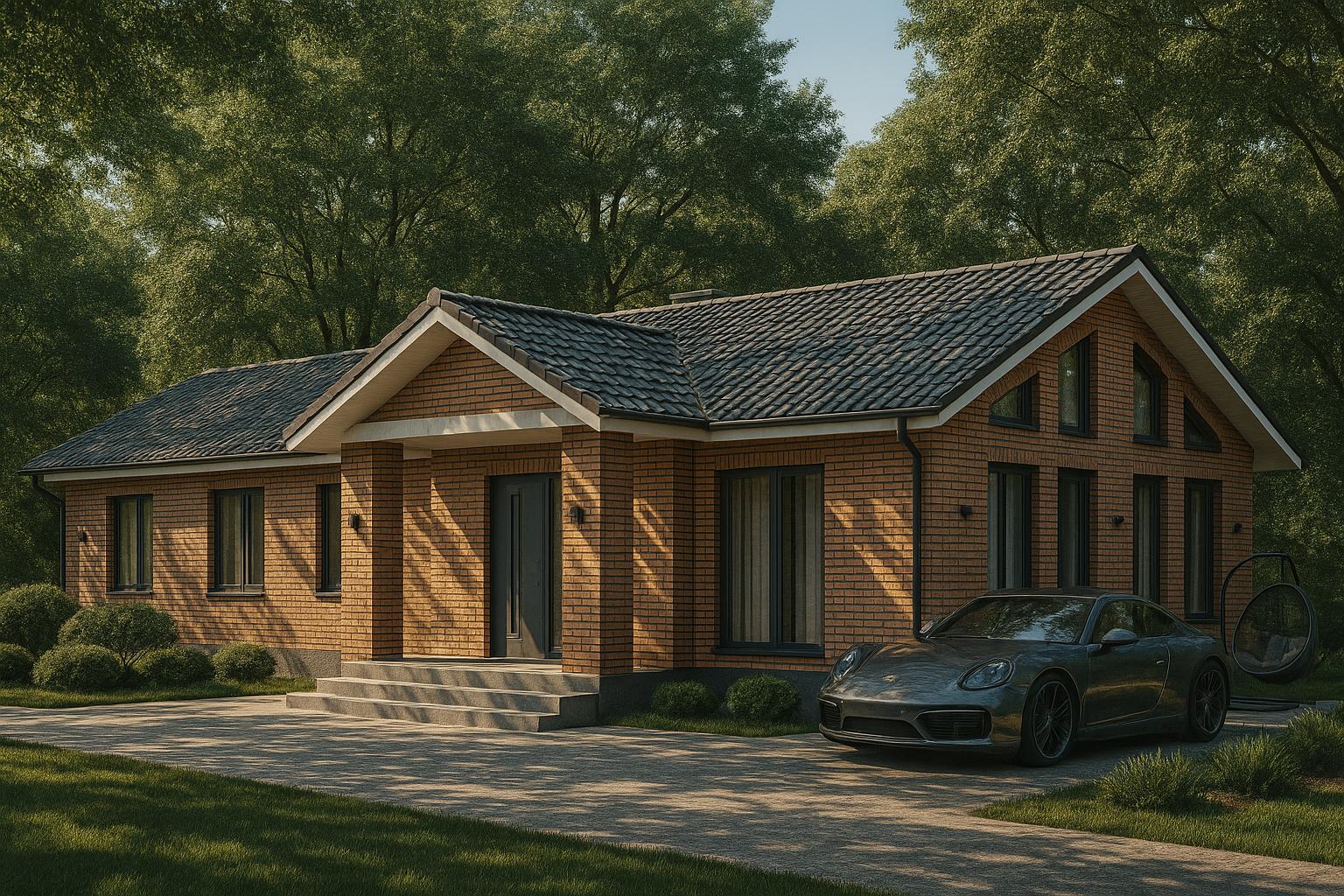 Штучная цементно-песчаная черепица BRAAS с необходимыми доборными элементами. Подкровельная мембрана «Ютайвек». Отделка карнизов и свесов кровли фиброцементной доской, либо софитами Docke.