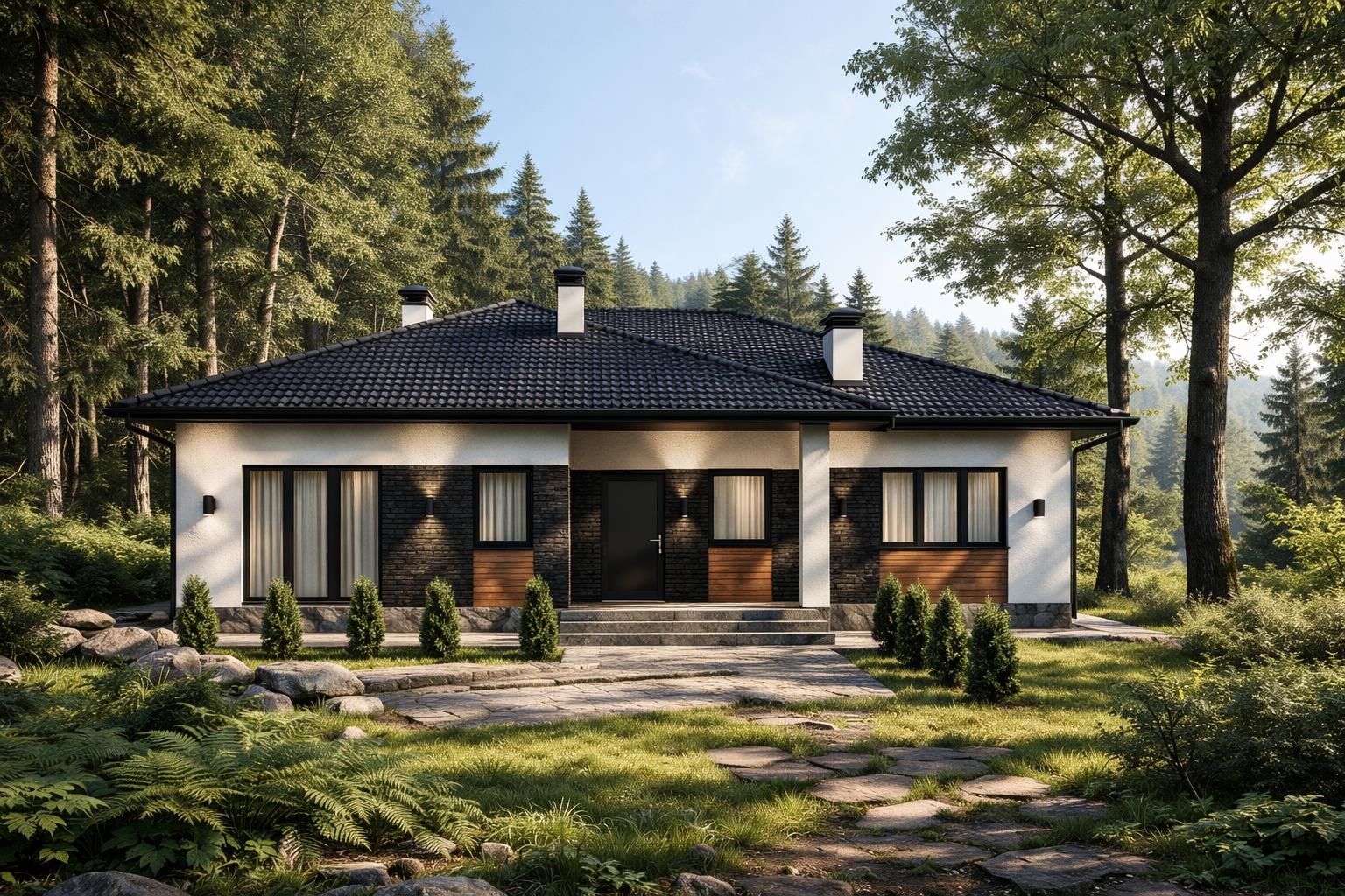 Штучная цементно-песчаная черепица BRAAS с необходимыми доборными элементами. Подкровельная мембрана «Ютайвек». Отделка карнизов и свесов кровли фиброцементной доской, либо софитами Docke.