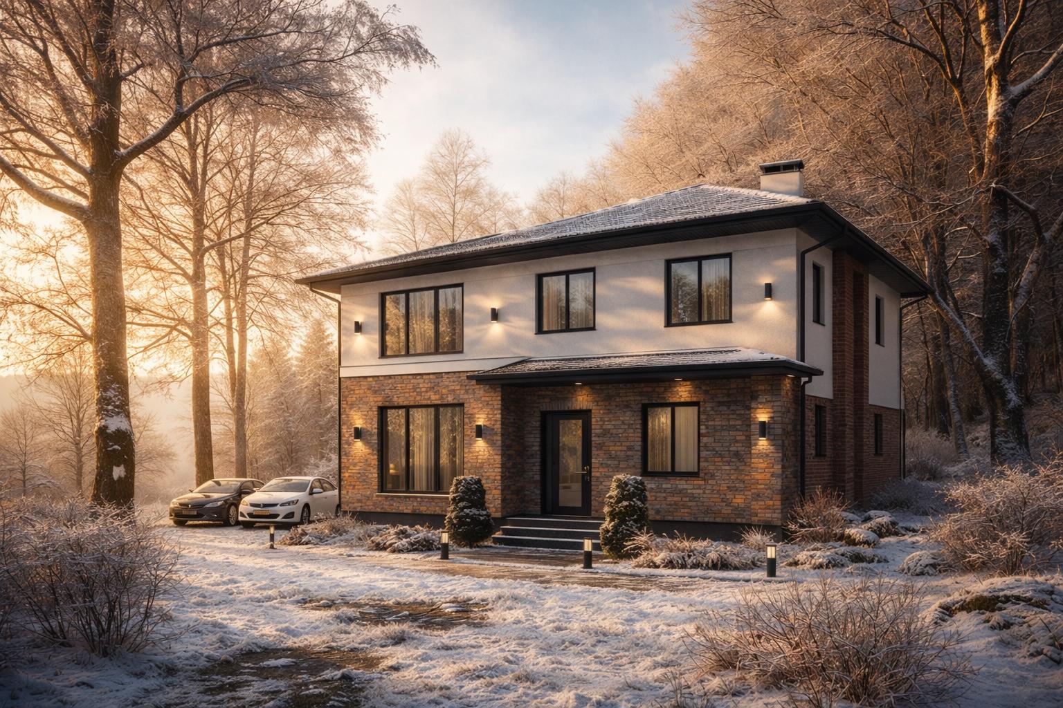 Утепленная металлическая дверь с терморазрывами по коробке и полотну, с металлическим окрашенным листом снаружи и ламинированной под дерево внутренней панелью МДФ. Оконные блоки из профиля MELKE (Россия) с двухкамерными стеклопакетами 32мм.