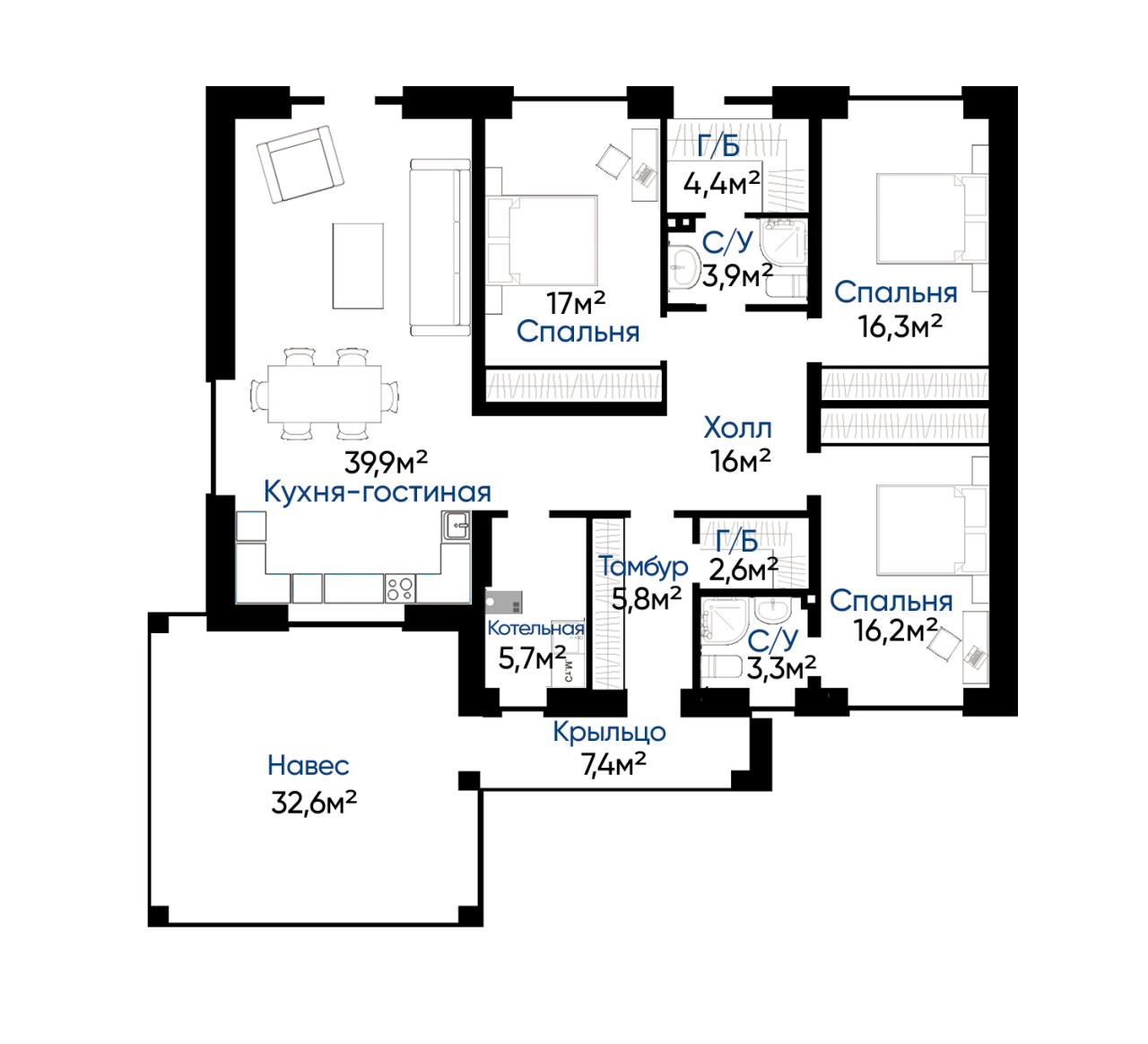 Штучная цементно-песчаная черепица BRAAS с необходимыми доборными элементами. Подкровельная мембрана «Ютайвек». Отделка карнизов и свесов кровли фиброцементной доской, либо софитами Docke.
